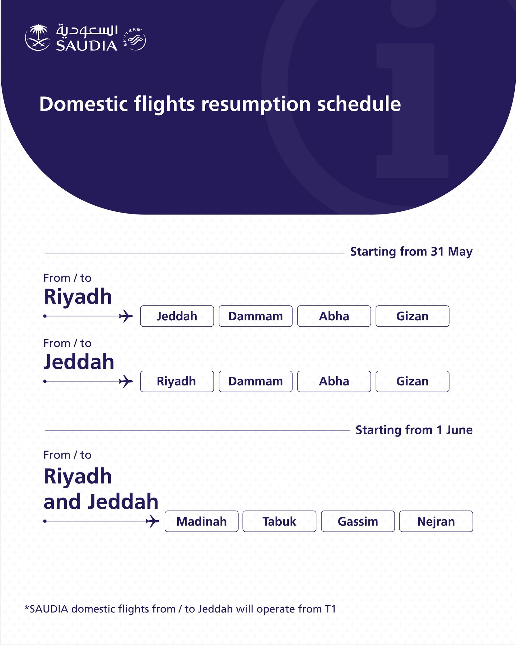 السعودية Saudia On Twitter Dear Guests Saudia Announces The Domestic Flights Resumption Schedule All Domestic Flights From To Jeddah Will Operate From New Jeddah Airport Terminal 1 Together We Fly Again